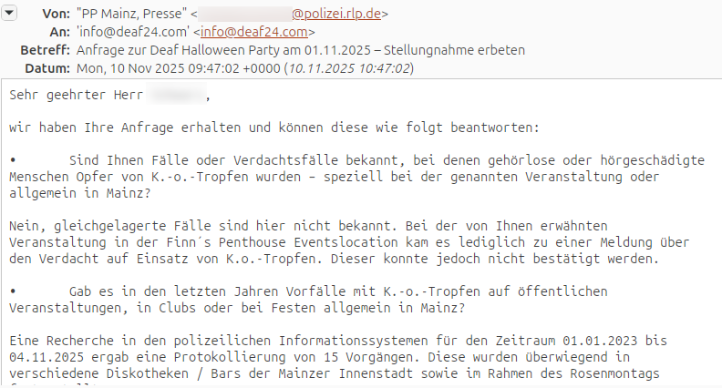 The Mainz Police have issued a statement to Deaf24 regarding the Deaf Halloween Party held on November 1, 2025, at Finn’s Penthouse in Mainz. The inquiry was prompted by suspicions that date rape drugs might have been in circulation at the event.